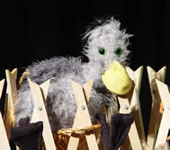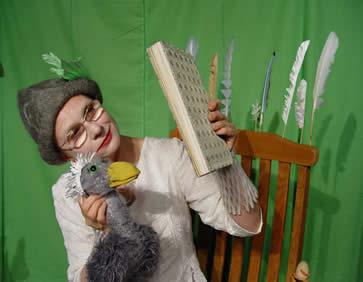 Fräulein von Märchen spielt und erzählt Märchen und reist durch die Welt Sie findet einen einsamen, grauen absonderlichen Vogel. Mit Dingen, die zu ihr gehören, dem Reise-Ei, Federknäuel, Teegeschirr und Märchenbuch mit Wunder-Seiten erzält und spielt sie „Das hässliche junge Entlein“ von Hans Christian Andersen